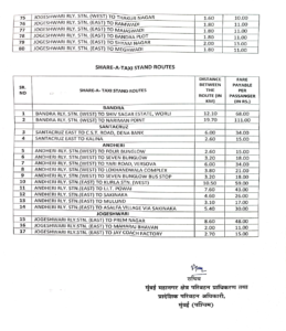 शेअर-ए-ऑटोरिक्षा व शेअर-ए-टॅक्सी या योजनेतून प्रवास करण्यासाठी मान्यताप्राप्त स्टँड यादी व त्या-त्या मार्गावर प्रतीप्रवासी किती भाडे देय आहे याची यादी सोबत जोडण्यात आली आहे, असे सचिव मुंबई महानगर क्षेत्र परिवहन प्राधिकरण तथा प्रादेशिक परिवहन अधिकारी, मुंबई (पश्चिम) यांनी प्रसिद्धीपत्रकामार्फत कळविले आहे.