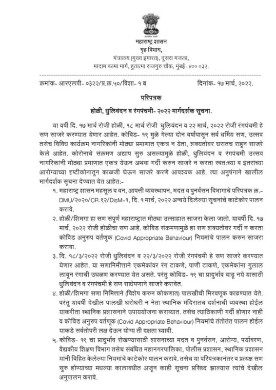 होळी, धूलिवंदन व रंगपंचमीबाबत गृह विभागाने मार्गदर्शक सूचना जारी केल्या आहेत. होळी, धूलिवंदन व रंगपंचमी उत्सव नागरिकांनी मोठ्या प्रमाणात एकत्र येऊन अथवा गर्दी करुन साजरे न करता स्वतःच्या व इतरांच्या आरोग्याच्या दृष्टीकोनातून काळजी घेऊन साजरे करावे, असे गृह विभागाच्या मार्गदर्शक सूचनांमध्ये नमूद करण्यात आले आहे.